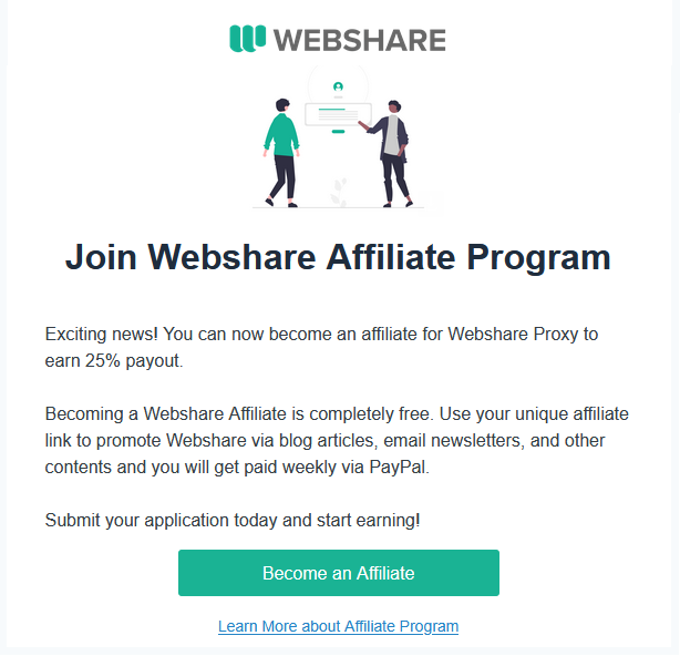 Becoming a Webshare Affiliate is completely free. Use your unique affiliate link to promote Webshare via blog articles, email newsletters, and other contents and you will get paid weekly via PayPal.