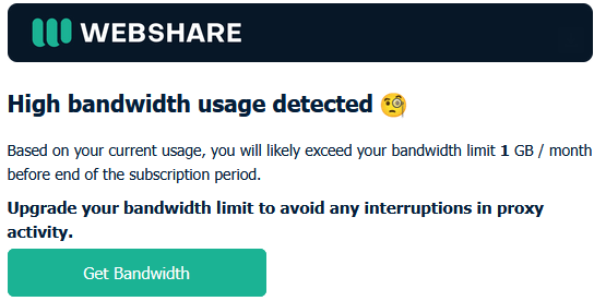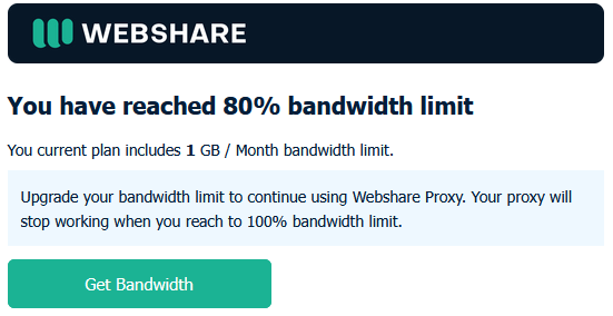Upgrade your bandwidth limit to continue using Webshare Proxy. Your proxy will stop working when you reach to 100% bandwidth limit.